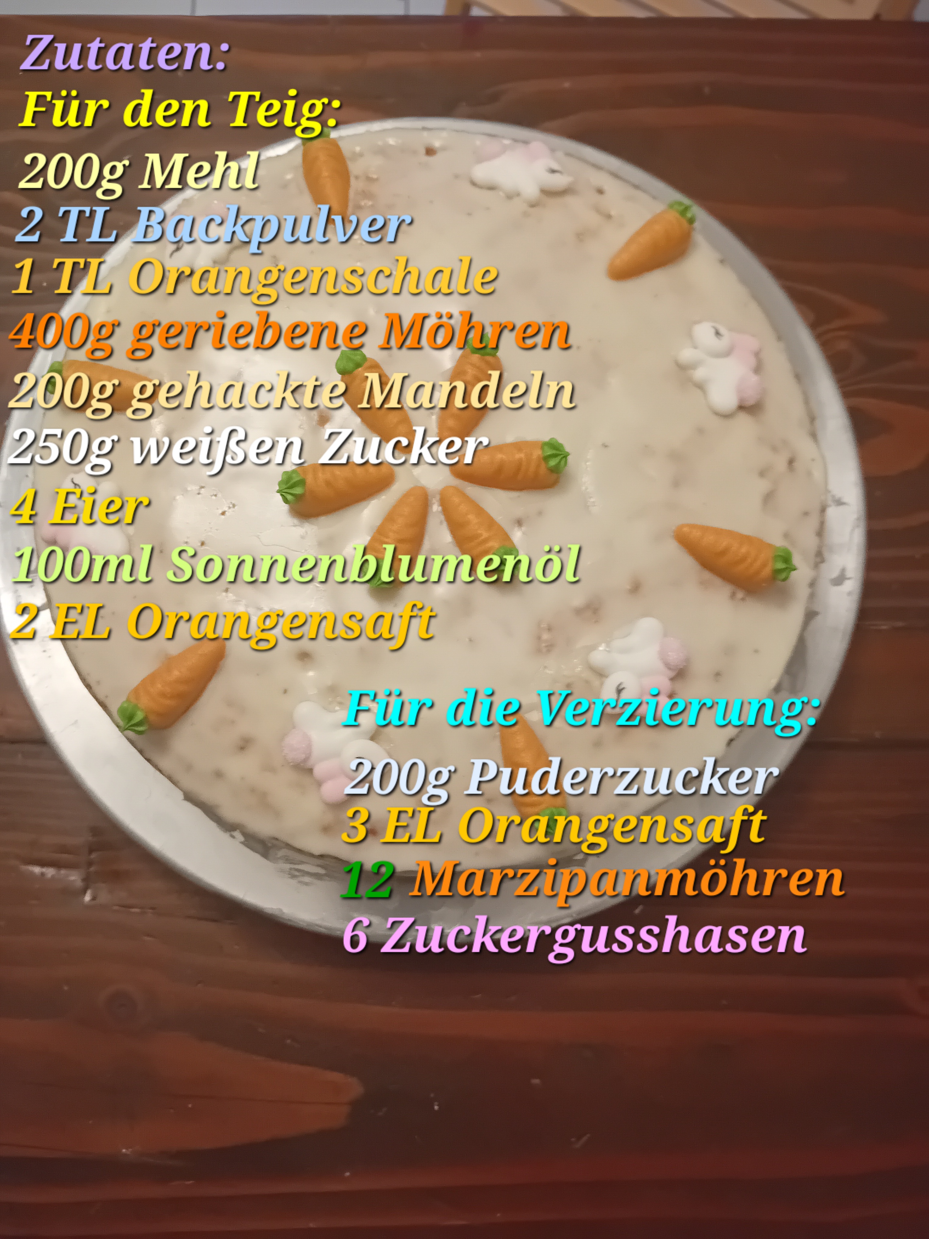 Hi Leute, ich bins wieder, eure Edda Morton, und ich habe neulich (anlässlich des Geburtstags meiner Nins) Möhrentorte gebacken. Das Rezept habe ich hier eingestellt :) ich hoffe, es schmeckt euch. Bei mir zuhause ging der Kuchen ziemlich schnell weg;))